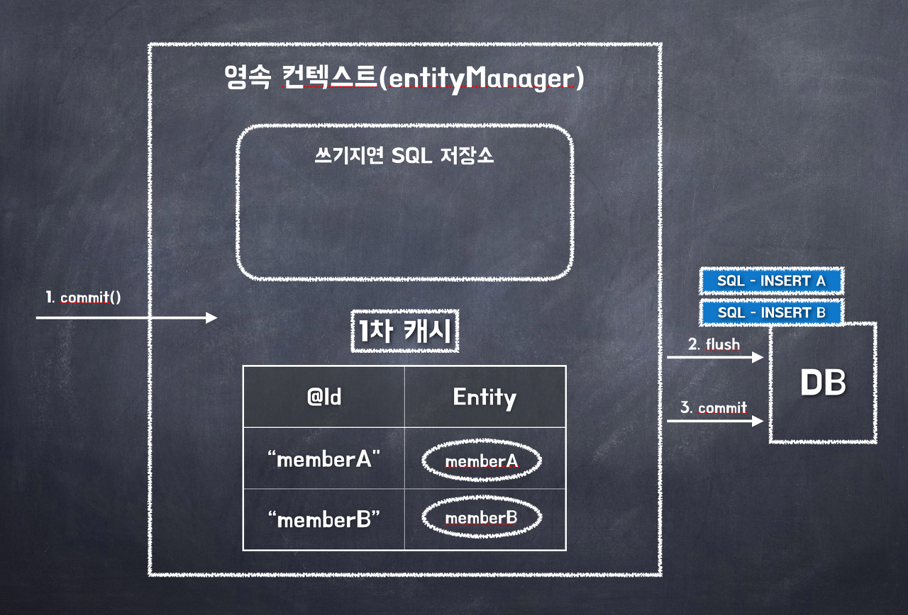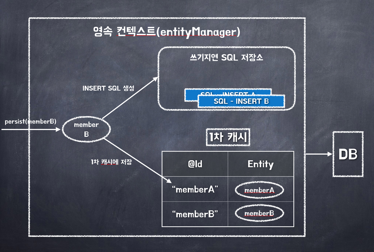 트랜잭션을 걸어 INSERT 쿼리를 DB에 바로 날리지 않고 1차 캐시에 저장하는 동시에 쓰기 지연 SQL 저장소에 쌓아두었다가 트랜잭션 commit 일때 DB 에 쿼리를 날림. 이는 DB 와 필요한 순간에만 통신을 하기 때문에 DB 테이블 Row 에 Lock 이 걸리는 것을 최소화 하는 이점이 있다.
