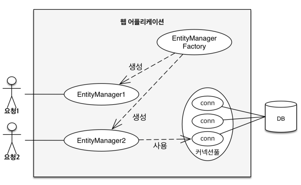 그리고 이 EntityManager 는 EntityManagerFactory에 의해 스레드당 하나씩 할당된다. (여러 스레드가 동시에 접근시 동시성문제가 발생하기 때문)