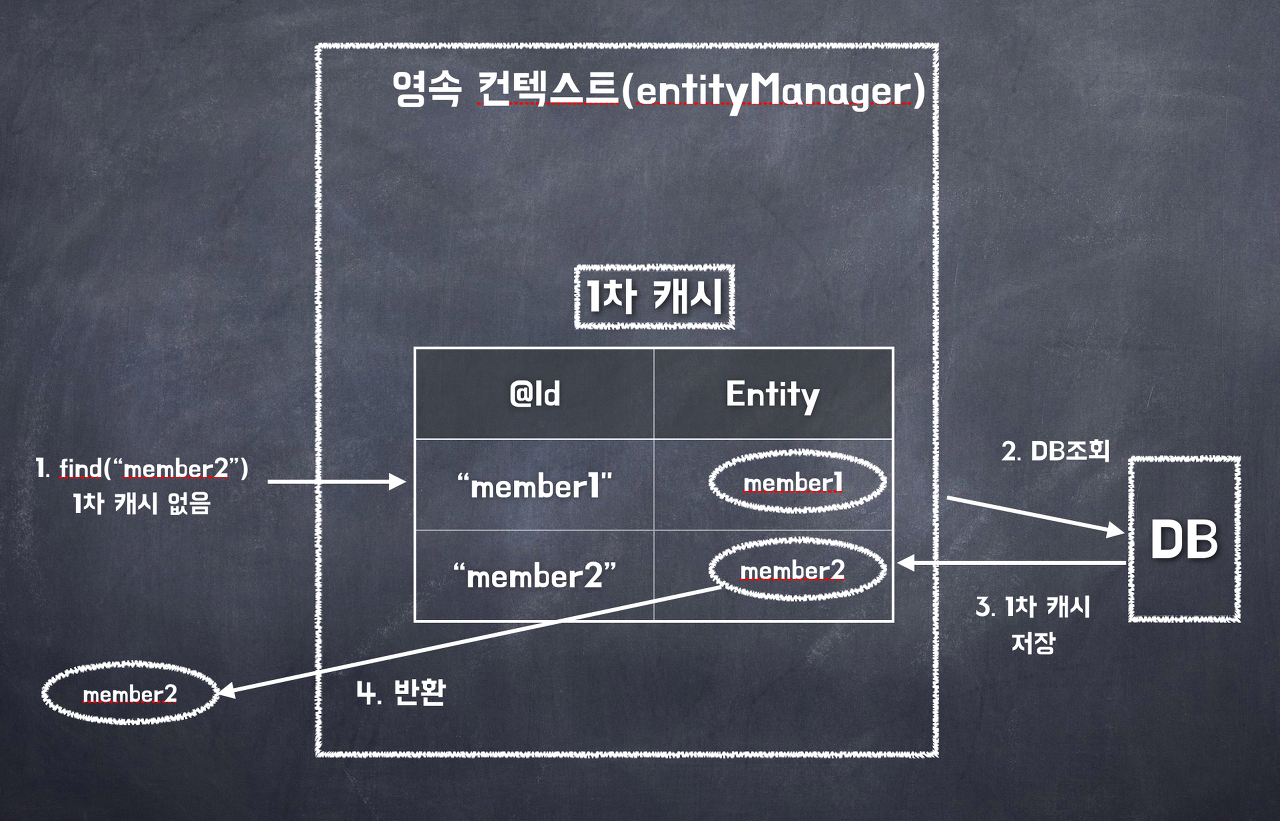 DB 에 저장된/저장할 Entity 들을 캐싱 해놓고 관리하는데 이를 1차 캐시라고 부른다. 그리고 이 영속성 컨텍스트는 EntityManager 라는 JPA 인터페이스를 구현한 객체를 통해 관리할수 있다. (조회, 업데이트, 삭제)등의 일들은 EntityManager 를 통해 처리해야 한다.