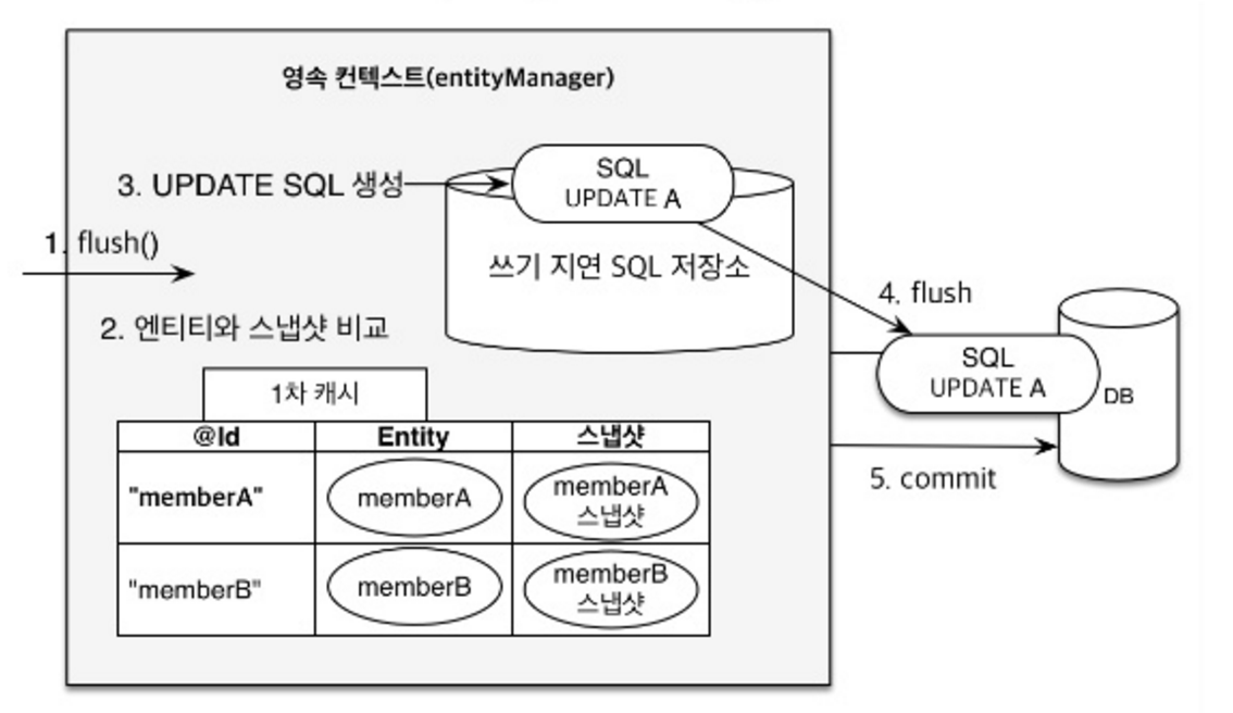 트랜잭션 커밋시 영속성 컨텍스트에 같은 Entity 가 저장되어 있다면 변경된 값을 비교하여 찾고 있다면 수정 쿼리를 생성하여 DB 에 쿼리를 날린다. DirtyChecking 이라 부르며 수정 작업에 쓰인다.